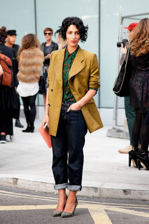 Her look. Casual with a rock’n’roll feel. Her outfit is made up of dark pieces including drainpipe skinny jeans and a monochrome T-shirt. A chic blazer and chain-strap handbag give her look a more structured feel and feminine touch. A simple pair of sneakers allow her to stroll around town easily. Aviator sunglasses act as the finishing touch. Her look is urban, modern and simple to wear for day-to-day occasions.