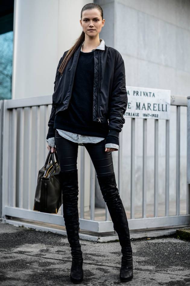Her look: Casual-chic of course! She combines leather pants with a long grey shirt and black sweater. On top, a black bomber jacket gives her outfit a more relaxed vibe. As for her choice of footwear, her pants are neatly tucked into black boots. A casual brown leather tote means she can easily carry all of her essentials. This look can be worn for any occasion, and compliments her hairstyle perfectly.