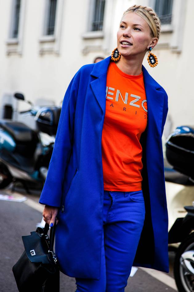 Her look? Ultra-colourful! The sun is back so why not treat yourself to some bright and beautiful colours. Our streetstyle of the day has gone for two bold colours: electric blue and orange. Two colours that go together perfectly but which you have to be daring to wear. If you want a colour-rich look, dare to wear this combination with a top and trousers for example. If you’re feeling less adventurous, go for colourful accessories or a bright manicure.
