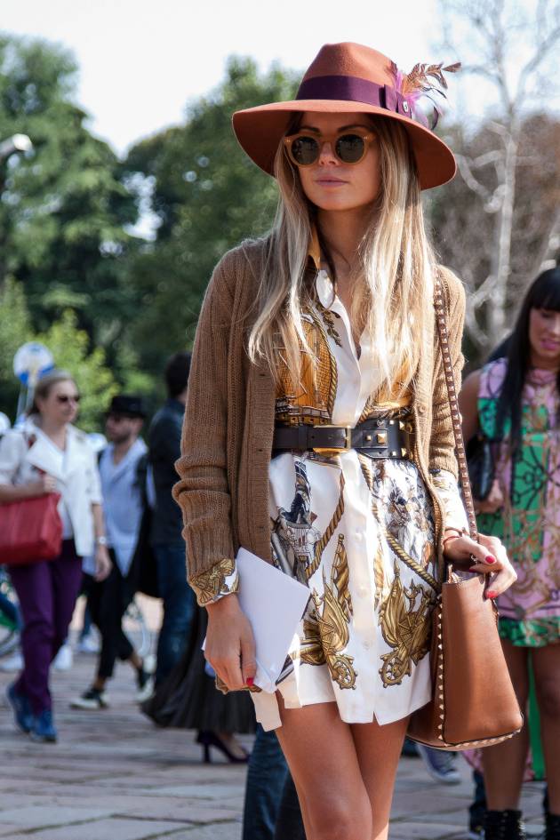 The look. Her style has a distinctly bohemian-chic feel. The base of her outfit is centred on a tunic which is belted at the waist. On top she accessorizes with a gilet and hobo bag in tan leather. To compliment her golden accessories, a felt hat and oversized sunglasses make her look like a glamorous star. This girl sure knows how to put an outfit together!